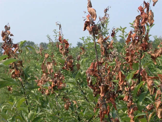 Одна з найвідоміших бактеріальних хвороб, яка може виникнути на яблуні – бактеріальний опік плодових культур. Хвороба викликається бактерією з роду Ервінія – Ervinia amylovora, яка вражає всі надземні органи яблуні. Дерево виглядає так, ніби воно почорніло від вогню і вмирає. Бактеріальний опік плодових – карантинна хвороба.