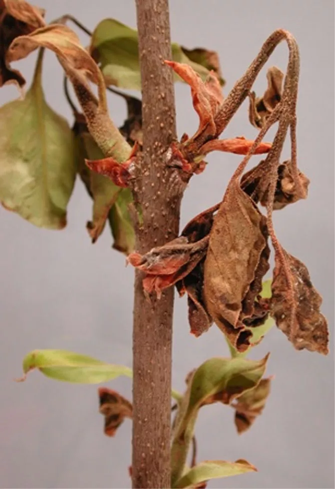 - на пагонах з'являються некротичні плями, після чого формуються потовщені рани зі слизотечею, гілки дерева відмирають.