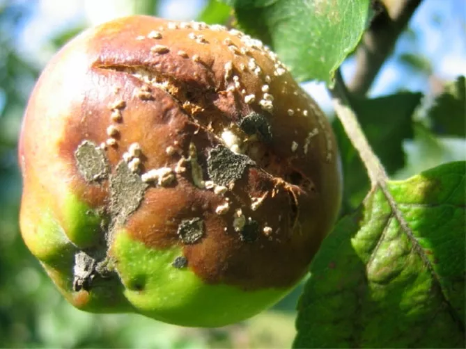 - може вражати ця хвороба плоди яблуні, на яких з'являються гниючі плями, спочатку дрібні, потім збільшуються.