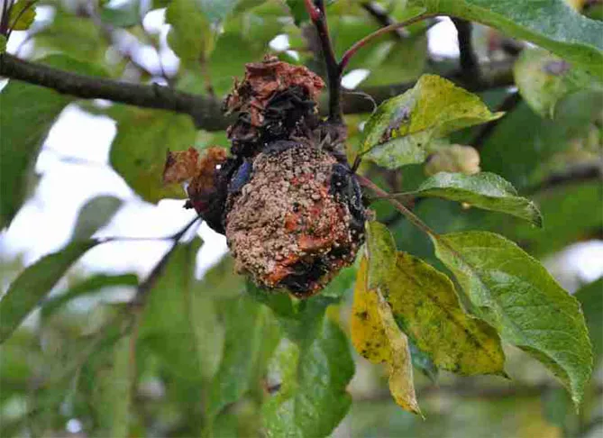 Фото. На плодах яблуні видно прогресуючу моніліозну гниль.