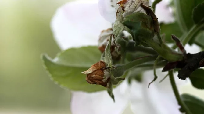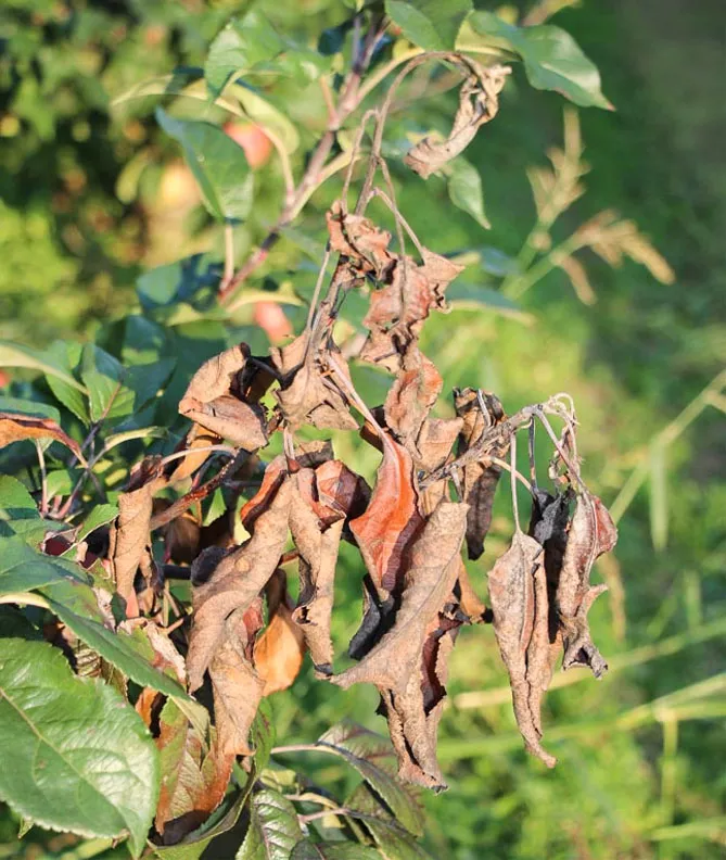 Фото. Бактеріальний опік плодів і листя яблуні