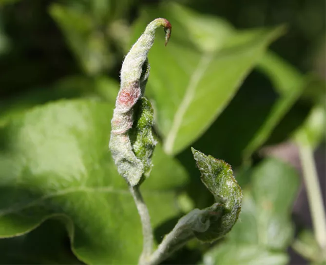 - сильно заражені листові бруньки часто відмирають і не розвиваються в наступному сезоні, менш заражені листки дрібні, скручені, зморщені, мають подовжені черешки;