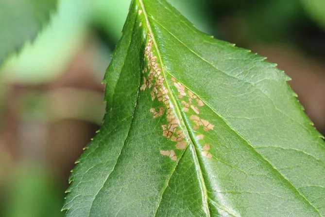 - на листкових пластинах з'являються маленькі коричневі плями, розкидані по всій поверхні;