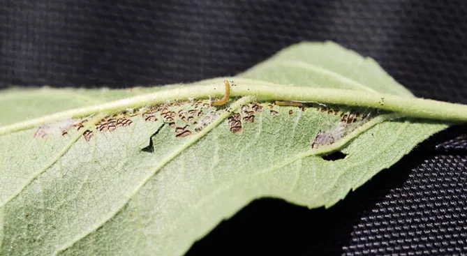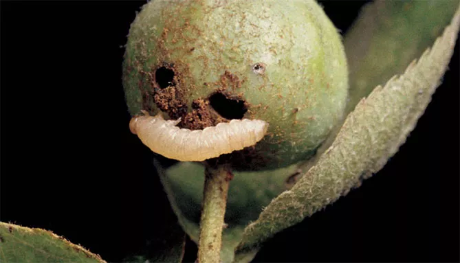 Hoplocampa testudinea – шкідник, довжина тіла досягає 7 мм. Тіло жовтого шкідника закінчується зазубреним диском. Одне покоління розвивається протягом року. Личинка шкідника біла або кремова, лялечка білувата. Самиці живляться пилком, відкладають яйця всередині квітки. Отрімання личинок відбувається в кінці цвітіння яблунь. Комаха знищує насіннєву камеру яблука. Пошкоджені плоди опадають. Одна особина може пошкодити до 5 бруньок. Поріг загрози для шкідника становить 20 тіл на 1 білу липку пастку.