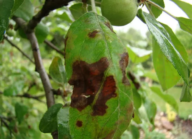 - пізніше з'являється іржа на листках яблуні, плями набувають коричневого кольору, листки висихають, опадають;