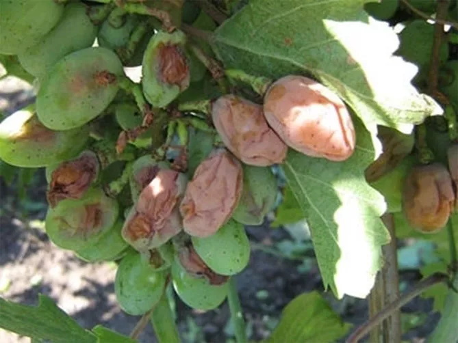 - симптоми захворювання часто зустрічаються на незрілих ягодах; зазвичай страждають сорти з компактними гронами, що погано провітрюються – псуються ягоди коричневі з білим міцелієвим нальотом; гниль зустрічається дуже часто в період дозрівання врожаю.