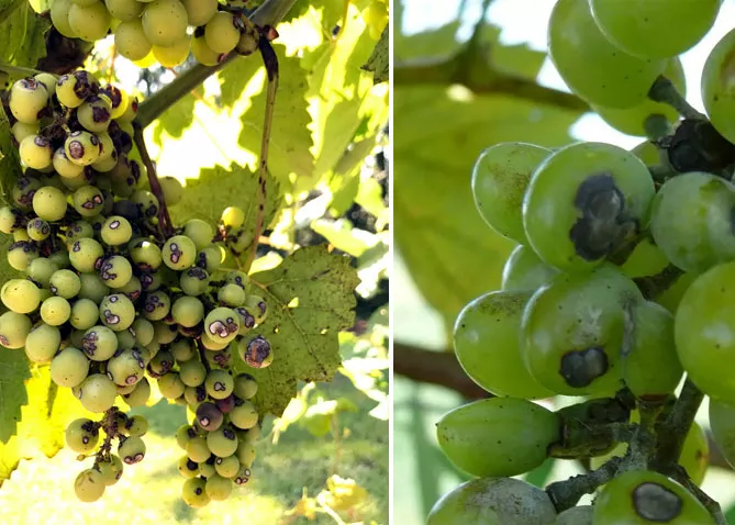 - Уражені хворобою ягоди винограду покриваються чорними пікнідами, гниють, висихають.
