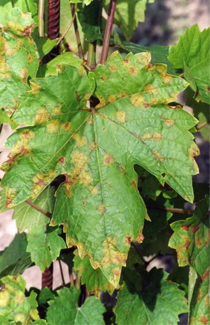 - на молодих листках винограду хвороба проявляється у круглих, жовто-оливкових плямах або іржавих, напівпрозорих плямах;