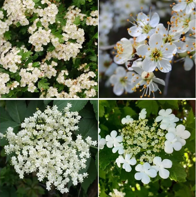 Фото. Приклад рослин для дикого екологічного живоплоту: глід однопестичний, терен (Prunus spinosa), бузина чорна (Sambucus nigra), калина звичайна (Viburnum opulus).