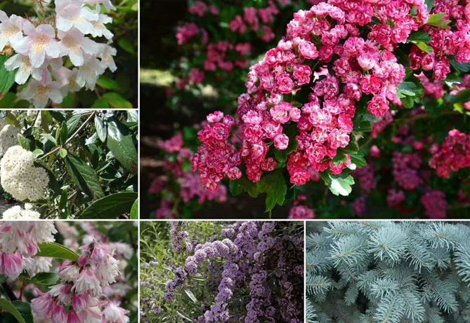 Фото. Ідея комбінації рослин для чагарникового масиву: глід «Пауль Скарлет», Кольквіція чарівна (Kolkwitzia amabilis), Калина празька (Viburnum pragense), Дейція шорстка Плена (Deutzia scabra ‘Plena’), Буддлея черговолиста (Buddleia alternifolia), Ялина колюча «Глаука Глобоза» (Picea pungens ‘Glauca Globosa’).