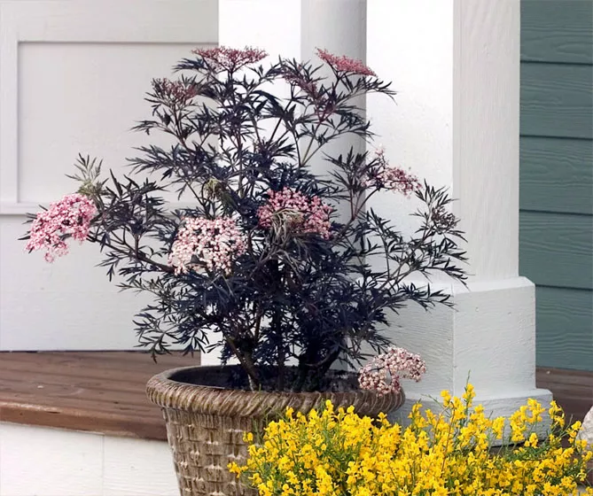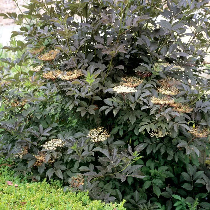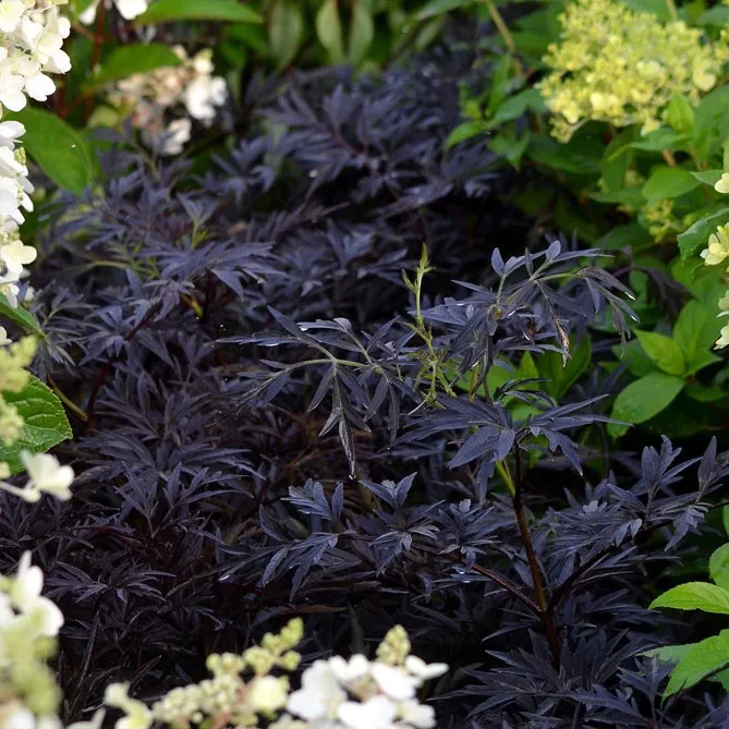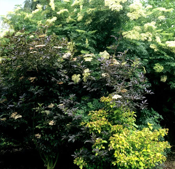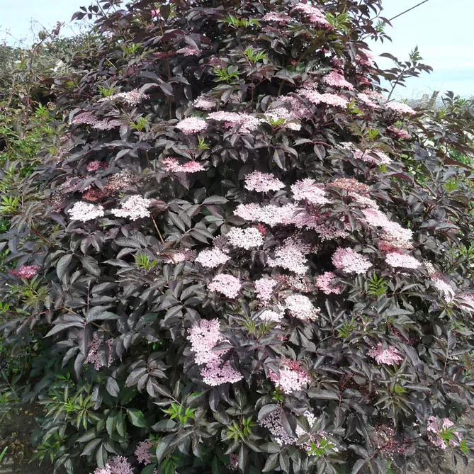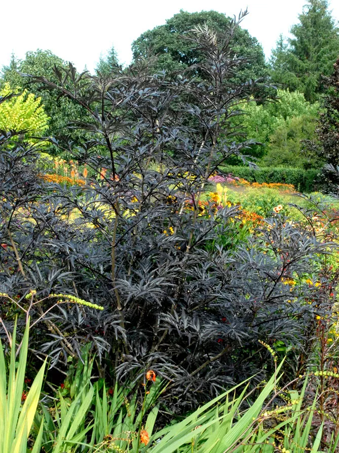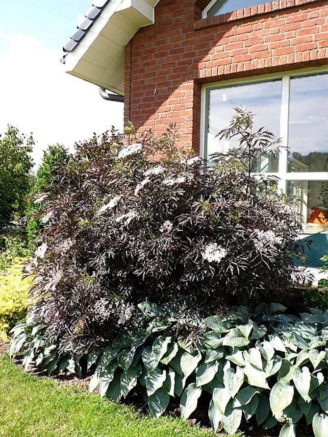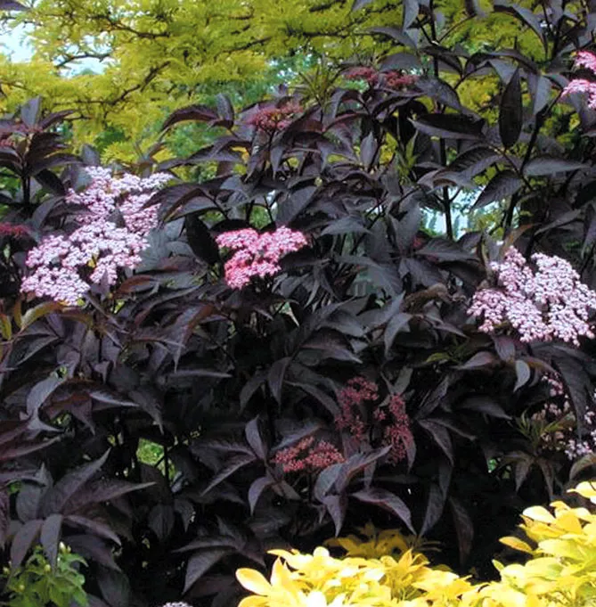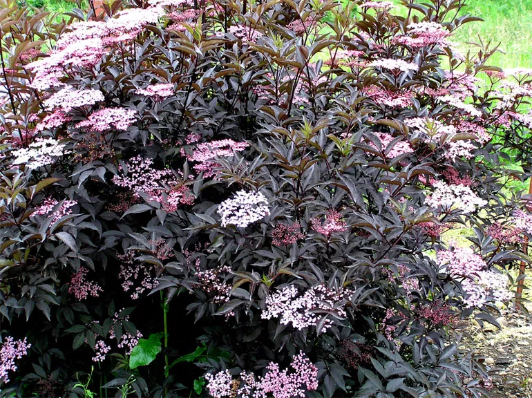 Для гармонії рожевого та фіолетового на клумбі посадіть сорт бузини «Блек Б'юті» у компанії з: