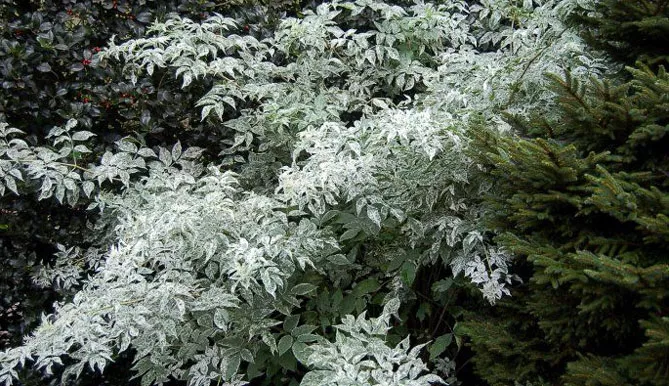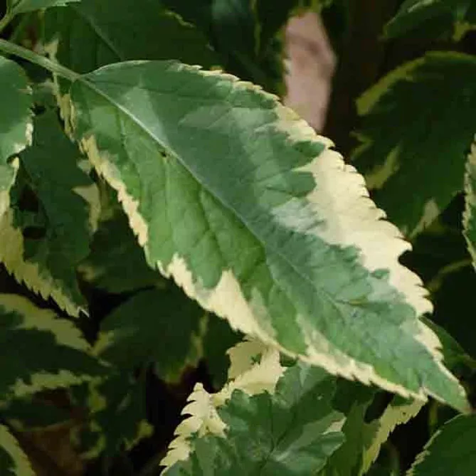Дуже яскравий строкатий сорт бузини «Мадонна» (Sambucus nigra ‘Madonna’) цвіте з травня по червень. Висота у зрілості – 2,5 м. Прикрасить сад темно-зеленим листям з жовтими строкатими плямами, яке освітить темні місця в саду.
