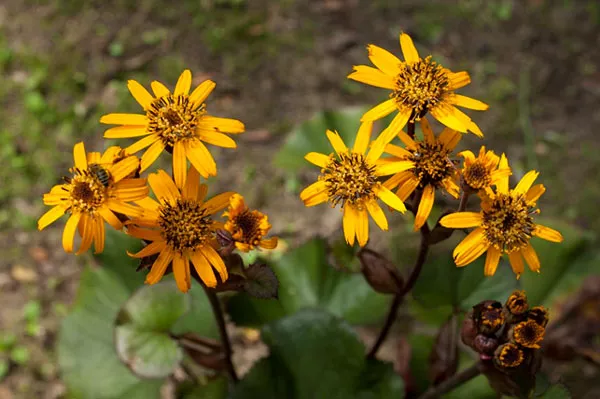 - Квіти. Влітку з'являються декоративні жовті або оранжеві суцвіття. Золотисті квіткові кошики діаметром до 10 см, у волотях або колосах з'являються на міцному стеблі, у деяких сортів квітконіс може досягати 2 метрів. Період цвітіння бузульника: з серпня по жовтень.