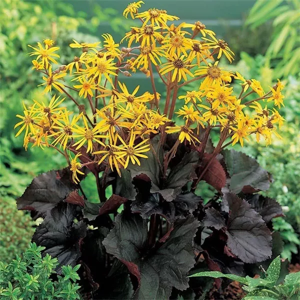 - Бузульник «Отелло» досягає висоти приблизно 80-120 см. Вражаючі листки Othello, темно-зелені зверху і пурпурні знизу, утворюють широкі пучки біля основи рослини. Сезон цвітіння – з липня по вересень. На високих жорстких пагонах з'являються великі суцвіття, квітки темно-жовті з золотистим забарвленням. Ґрунт має бути постійно вологим. Рослина морозостійка.