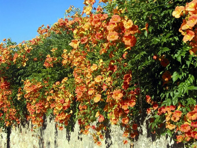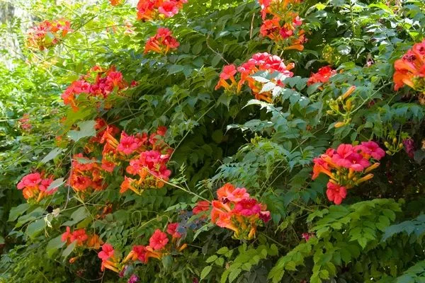 Великоквітковий кампсис – виючий квітучий чагарник висотою до 10 метрів, вирощується в південних регіонах. Росте пишно, щороку збільшується на 2-4 метри. Розцвітає в кінці літа, восени (серпень-вересень). Декоративні квітки довжиною 5-7 см залежно від сорту бувають різних кольорів: