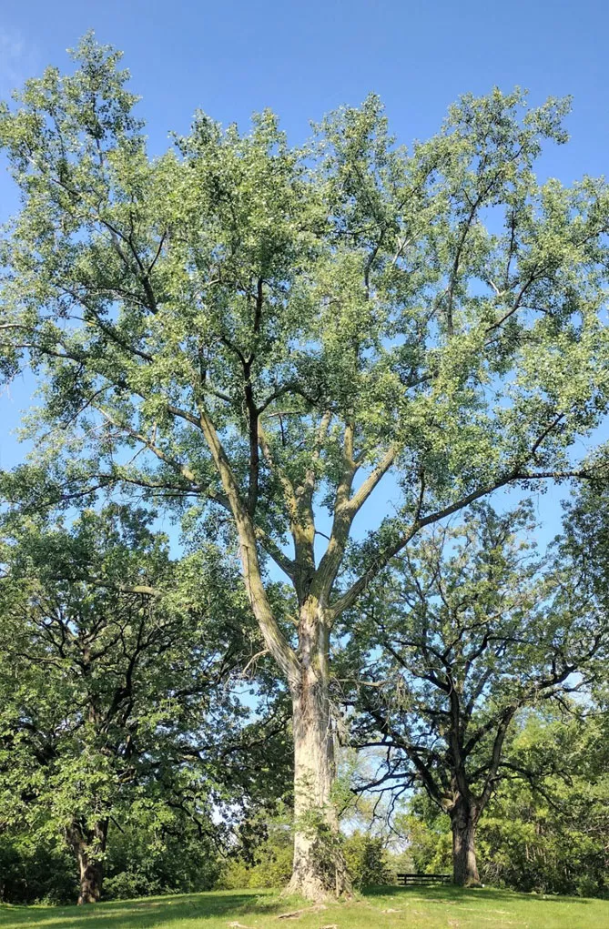Швидкорослий дуб болотяний (Quercus palustris) ширококонічної форми з направленими вниз гілками виростає на 30 см щорічно. Еліптичні, глибоко розсічені зелені листки восени стають темно-червоними або коричневими.