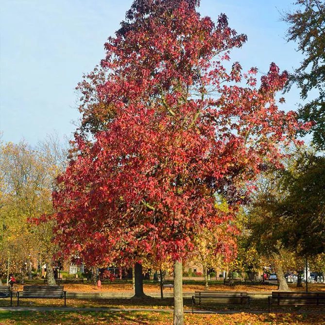 Ліквідамбар смолоносний (Liquidambar styraciflua) – одна з найбільш адаптивних листяних рослин за своєю стійкістю до різних ґрунтів та умов місцевості. Дуже гарне листя ліквідамбару восени – спочатку жовте, потім малинове та фіолетове. Крона пірамідальна, висотою до 30 м. Рослина любить сонячні місця, не любить застоїв води в ґрунті. Зимує в середній смузі добре.