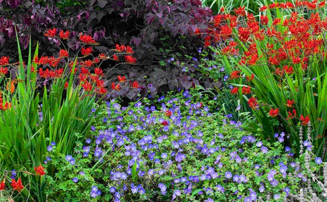 Фото. Церцис сорту «Форест пансі» ‘Forest Pansy’ з фіолетовим листям, крокосмія та садова герань