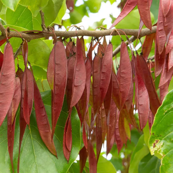 Яскраво забарвлене молоде листя з'являється ближче до кінця цвітіння, коли плоскі плоди-стручки починають червоніти. Плоди мають довжину 5-10 см, містять коричневі, тверді, округлі, плоскі, блискучі насінини. Червоно-коричневі стручки зберігаються на рослині навіть взимку, на радість синицям.