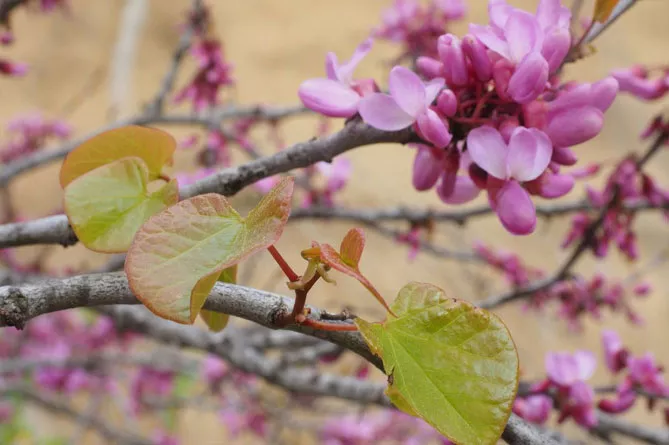 Cercis siliquastrum утворює гарне листя, яке добре підсвічується під час цвітіння.