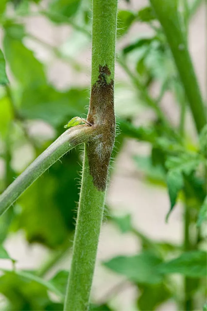 - на стеблах помідорів видно великі коричневі некрози;