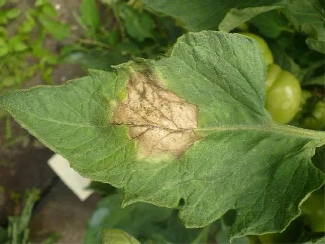 - на листках з'являються спочатку темно-зелені, водянисті, потім коричнюваті плями, дуже швидко поширюються по всій поверхні листа;