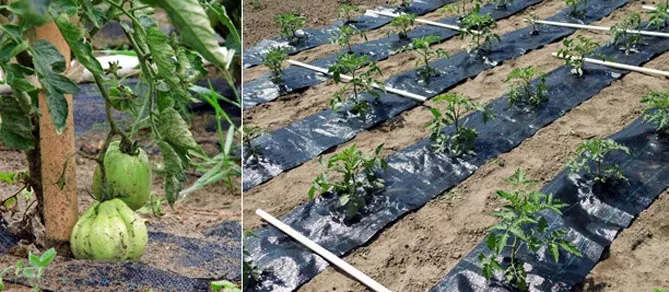 - Не дозволяйте томатам лежати на землі. Застилайте грунт навколо кущів нетканим матеріалом, чорним агротекстилем, соломою. Чорний агротекстиль прискорює дозрівання помідорів, утримує вологу в ґрунті. Під плоди можна пставити ящики.