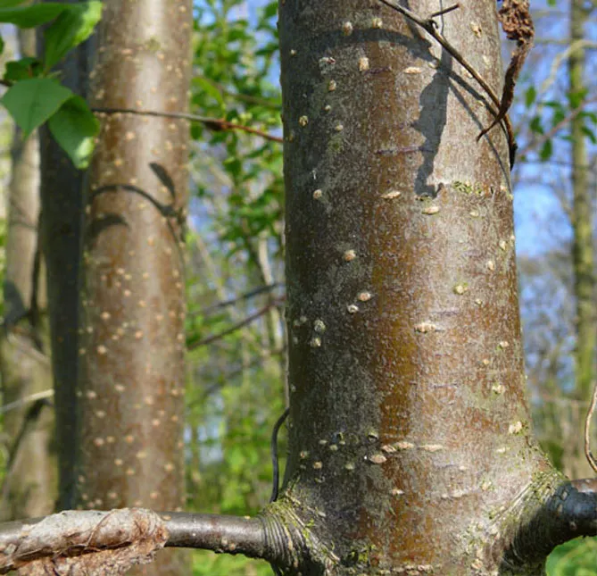 Пагони червонуватого кольору, старі гілки здаються трохи темнішими, вкриті світлішими чечевичками.
