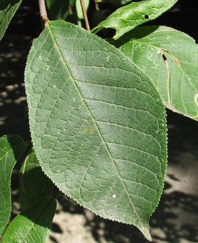 Чергові, ланцетні, досить широкі та дрібнозубчасті листки мають довжину 6-15 см, при розтиранні видають запах мигдалю. На зворотному боці на червоному черешку є нектароносні залози, що стикаються з листковою пластинкою. Кінчик листка загострений або закруглений. Яскравий, сизий, тьмяний зелений колір на зворотному боці листка різко змінюється восени на оранжево-червоний. При розпусканні молоді листки складаються навпіл.