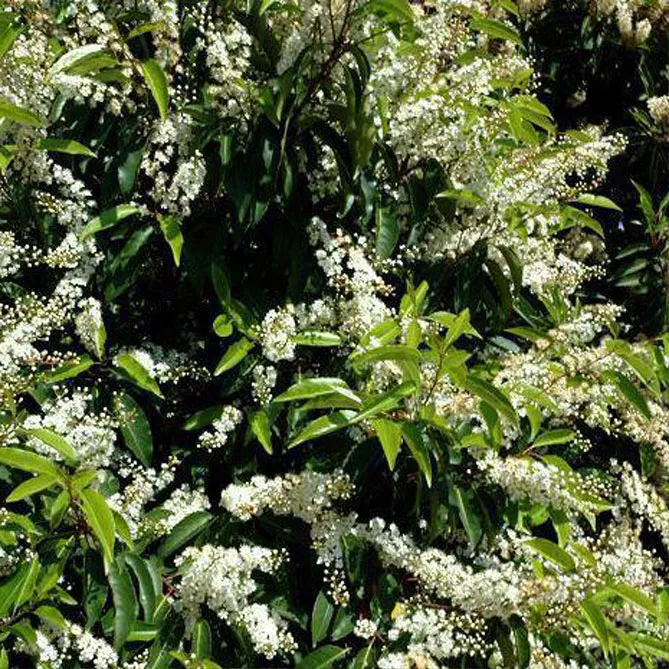 Красиві нектароносні білі грона квітів (7,5-15 см), вузькі та прямостоячі, потім трохи звисаючі, поширюють мигдальний аромат, з'являються у травні-червні. Деякі відчувають від них легкий рибний запах, який приваблює дрібних мух, а також бджіл та жуків. Квіти розташовані на довгому квітконосі. Віночок діаметром 1,2 см має 5 овальних пелюсток з нерівними краями. Він служить фоном для букета блідо-жовтих тичинок, що оточують довгий маточок. Чашечка квітки з опушеною внутрішньою частиною також має 5 чашолистків.
