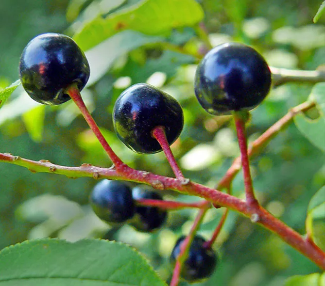 Грона круглих плодів розміром із горошину дозрівають у липні-серпні. Ці м'ясисті чорні кістянки з великими кісточками, що мають кислий та терпкий смак, переважно поїдаються птахами, але з них можна робити кислі лікери, желе або джеми. Вони містять невеликі кількості ціановодню, який зникає після кип'ятіння. Урожай рослина дає з інтервалом від 1 до 3 років.