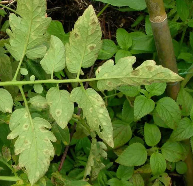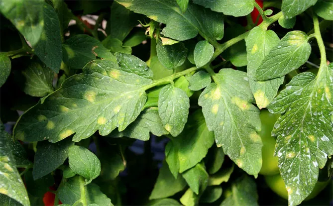 - Жовті плями на листі помідорів у теплиці можуть утворюватися через ураження кущів грибковими хворобами. Грибкова інфекція здатна проникнути у тканини з необеззаражених насінин, ґрунту, з добривами. При захворюваннях фузаріозом або антракнозом листики втрачають тургор навіть у рослин, що ростуть на вологому ґрунті. Щоб уникнути подібних захворювань, рекомендується удобрювати ґрунт на томатних ділянках, проводити профілактичні обробки. Хворі рослини можна обприскати будь-яким фунгіцидом, що містить мідь.