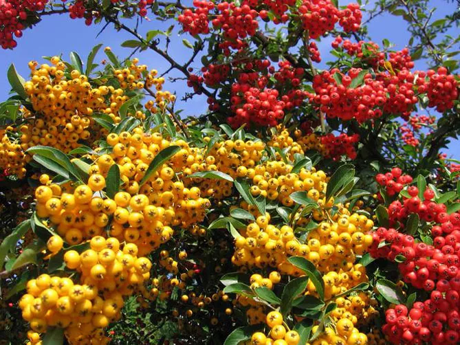 Листопадний чагарник піраканта яскраво-червона (Pyracantha coccinea), що виростає до 2-3 м у висоту. Має овальні напіввічнозелені листки, які буріють і опадають тільки після сильних заморозків. У м’які зими листя може залишатися на кущі практично до кінця зими. Цвіте піраканта у травні-червні. Квітки маленькі, білі. Яскраво-червоні або жовті плоди залишаються на кущі взимку.