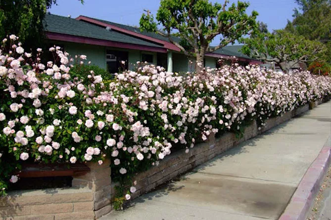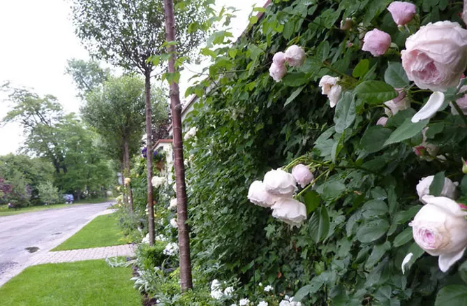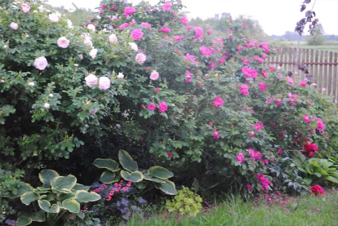 Для посадки перед парканом можна використовувати Шипшину зморшкувату і дикі види, що мають гарні квіти і червоні плоди. Шипшина зморшкувата виростає до 2 м. Росте на сухих ґрунтах. Кущ має низькі вимоги і виняткову життєздатність, здорове листя і інтенсивний аромат. Він відмінно підходить для масових посадок, створення ароматного живоплоту. Важко пройти повз байдуже – квіти шипшини дивують ароматом і красою.
