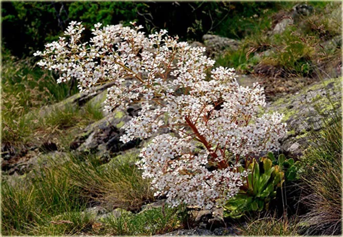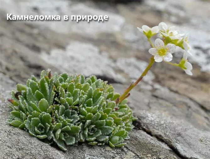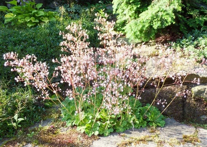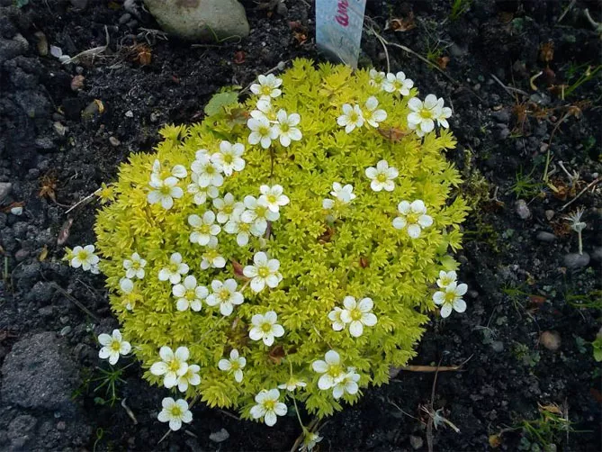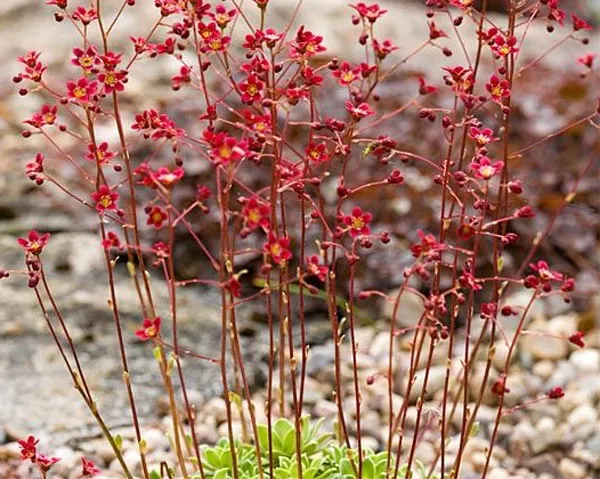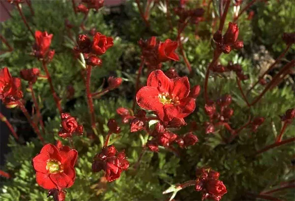Листки з рифленим краєм, квітки зібрані в рихлі волоті, зіркоподібні, білі з червоним центром. Висота квітучого куща може досягати 30 см. Цвітіння настає у травні. Розмножується краще поділом. Ідеально підходить для тінистих рокаріїв, як ґрунтопокривна.