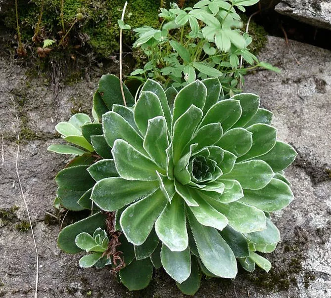 Розрив-трава котиледон – менш вимогливий вид, у природному середовищі існування зустрічається в Альпах. Висота без квітучих пагонів становить 10-15 см, під час цвітіння висота досягає 50 см. М’ясисті і зубчасті листки утворюють великі розетки, з яких росте квітконос. Після цвітіння розетка відмирає, але перш ніж це станеться, вона створить багато нових розеток. Білі квітки з’являються у червні, утворюючи волотисті суцвіття.