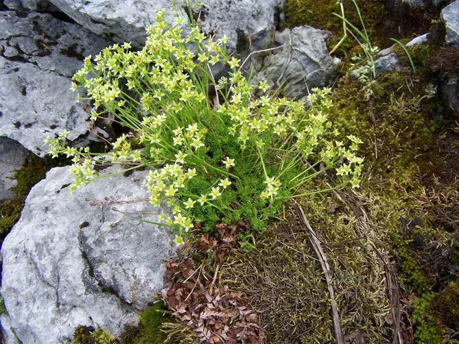 Saxifraga bryoides L. – розрив-трава моховидна зустрічається в горах Центральної Європи. Невеликий багаторічник утворює щільний дерн. Вся рослина бліда або жовто-зелена, більш старі листки сріблясто-сірі. Рослина створює численні суцвіття і кілька квітконосів. Це високогірний вид (рудофіт).