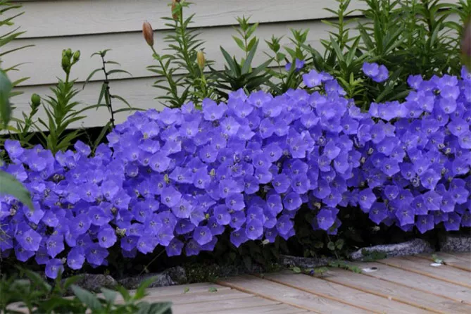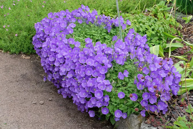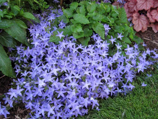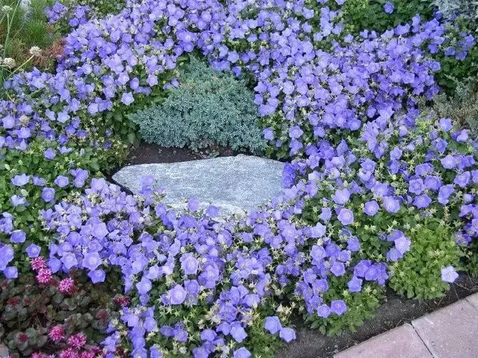 - Ложечницелистий (Campanula cochleariifolia) – багаторічник з численними синіми квітами.
