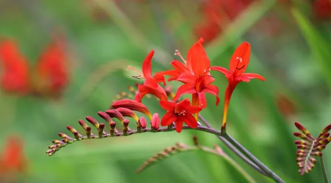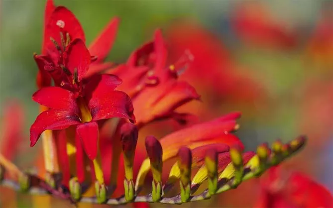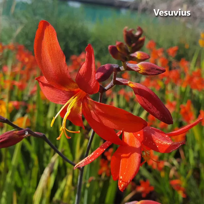 - Крокосмія «Люцифер» (Luficer) – досягає максимальної висоти 80 см, має унікальний, інтенсивний червоний колір. Автор Алан Блум (1906-1997) – відомий британський садівник. Цей сорт крокосмії любить сонце, краще саджати його в захищеному, сонячному місці, щоб пориви вітру не ламали високі квіти. Рослина не любить важкі, глинисті ґрунти. Краще підходять ґрунти середньої проникності, родючі. Чудово виглядає сорт з іншими крокосміями або з гладіолусами, створюючи привабливий контраст у таких композиціях. Монтбреції можна успішно використовувати як зрізану квітку для букетів.