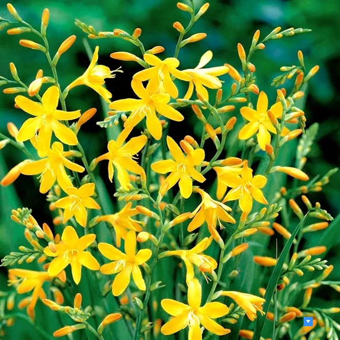 - Крокосмія «Джордж Девідсон» (George Davidson) – сорт досягає максимальної висоти 100 см. Відрізняється жовто-золотистим забарвленням суцвіття. Жовті суцвіття в обрамленні зеленого листя – вдале поєднання, що прикрашає вази. Davidson – надійно квітуча, чудова монтбреція, вирощування якої не доставить клопоту початківцям садівникам. Потрібне сонячне, тепле місце. Рослина досить морозостійка, при температурах нижче -10 °С потребує додаткового прикриття надземної та підземної частин.