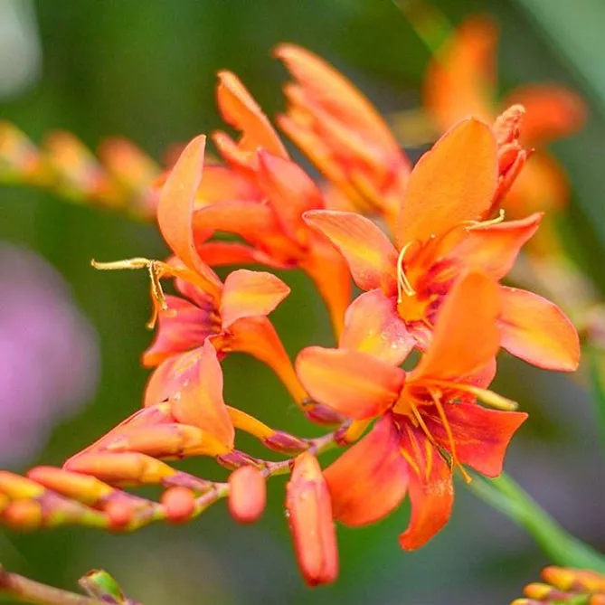 Крокосмія (лат. Crocosmia) також відома як японський гладіолус монтбреція належить до родини Півникових (Iridaceae). За зовнішнім виглядом рослина багатьом нагадує гладіолуси. У природному середовищі багаторічна монтбреція зустрічається на території Африки, у садах і парках – вирощується в Європі. У країнах походження крокосмію запилюють пташки колібрі, у нашому кліматі – бджоли, джмелі виконують аналогічну роль. Рослина, що росте в дикій природі, звикла до теплого клімату, тому не морозостійка.