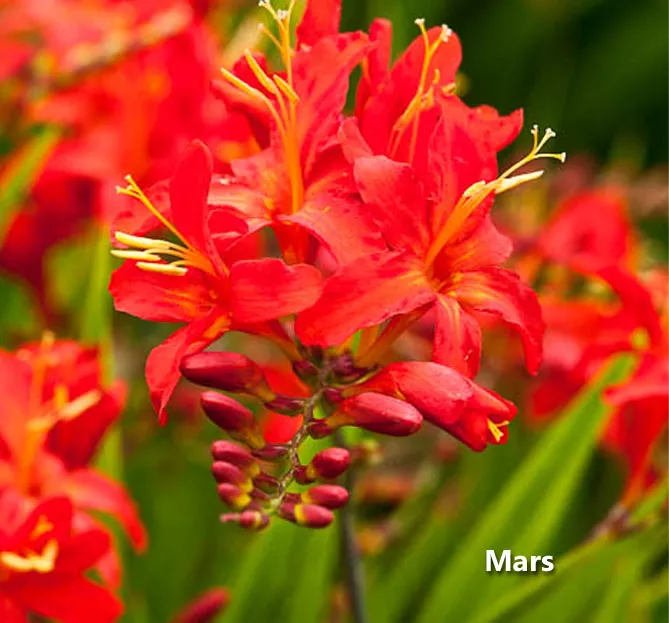 - «Марс» (Mars) – сорт крокосмії з оранжево-червоними або червоно-бордовими суцвіттями.