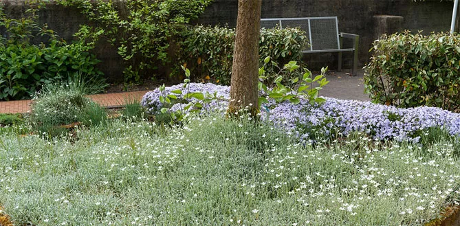 Ясколка альпійська (Cerastium alpinum) – створює килими білих квітів. Багаторічна рослина з тонкими, розгалуженими, повзучими стеблами та яйцеподібним, опушеним сріблястим листям, що досягає довжини 2 см. Білі квітки формуються на квітконосах на висоті 5-7 см над рослиною. Квіти з'являються з травня по червень.