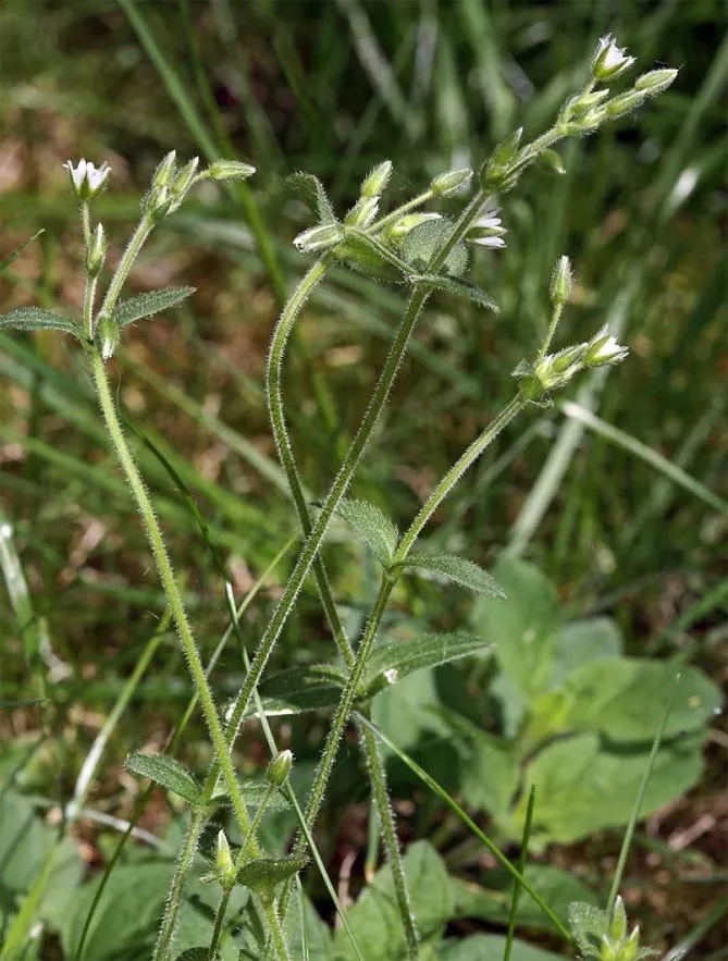 Ясколка звичайна (Cerastium holosteoides) – популярний бур'ян з маленькими квітами. Досягає висоти 10-50 сантиметрів. Рідко формує траву, частіше з'являється у вільних групах або окремо. Стебло трохи стелиться, але частіше підняте, іноді стає червоним. Розгалужена верхівка рослини покрита короткими ніжними волосками, як і листя, розташоване на коротких черешках або сидить прямо на стеблі. Вони приймають форму еліпса, гострі, подовжені. Через волохатість верхні сторони листків та стебла набувають трохи сірого або сіро-зеленого кольору.