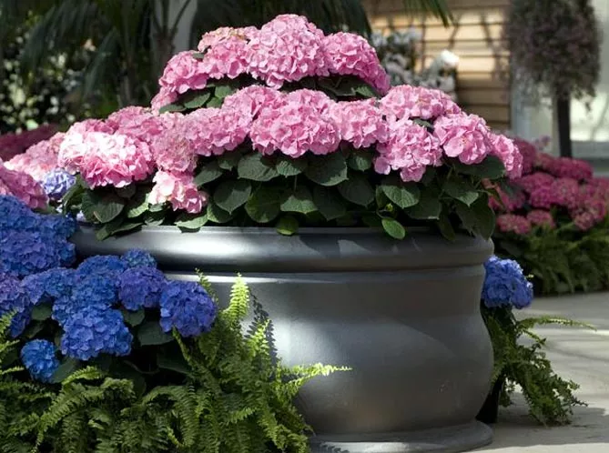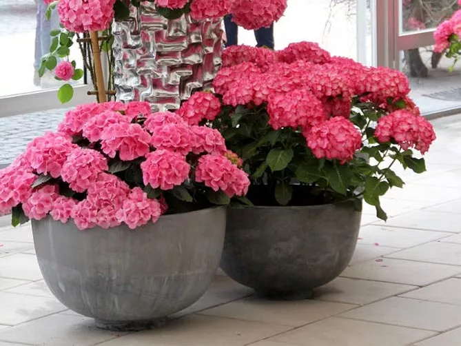 Існують сорти садової гортензії, призначені для вирощування у горщиках. Кущ всипаний квітковими кулями. Краще виглядає у керамічних великих горщиках. Гортензія не стійка до морозу, взимку її не можна зберігати на терасі.