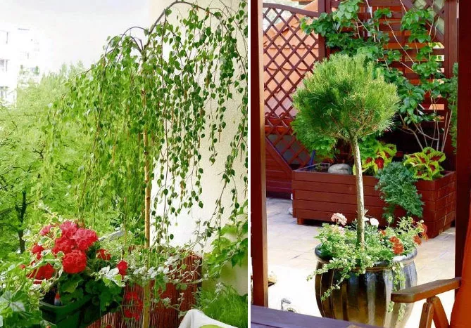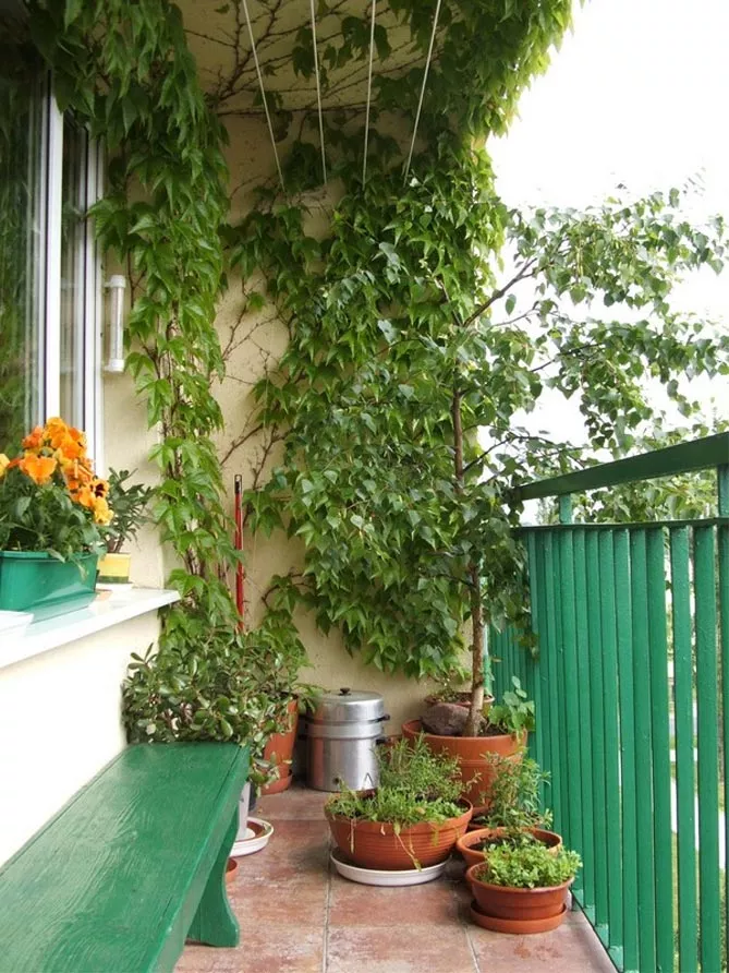 Маленький, обмежений за розміром балкон може стати маленьким лісом. Скромна сосна або береза, скупчення диких трав допоможуть відірвати погляд від екрана комп'ютера, дозволивши забути про метушню і набагато більше сприяють відпочинку, ніж свято квіткових барв. Правда, таку галявину важко порівняти з дикою природою, але навіть для птахів вона приваблива. Горобці та синички на гілках дерев шукають їжу.