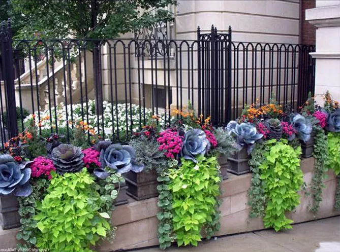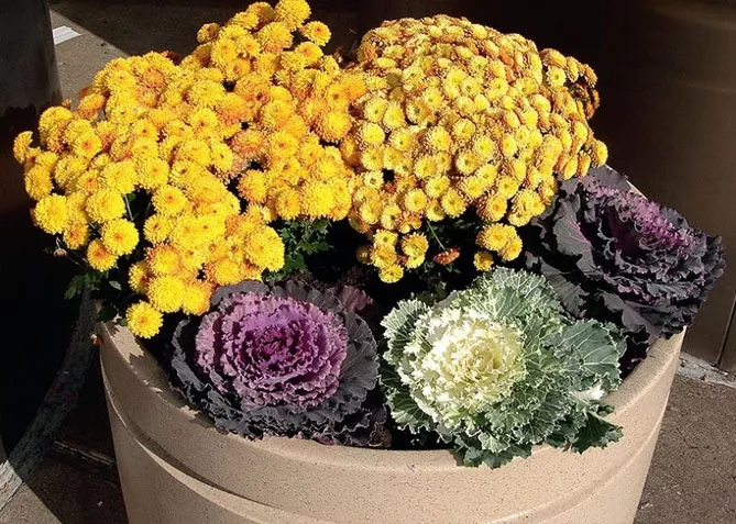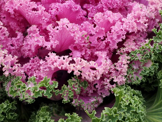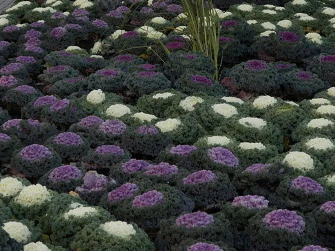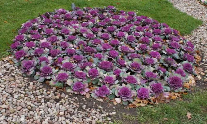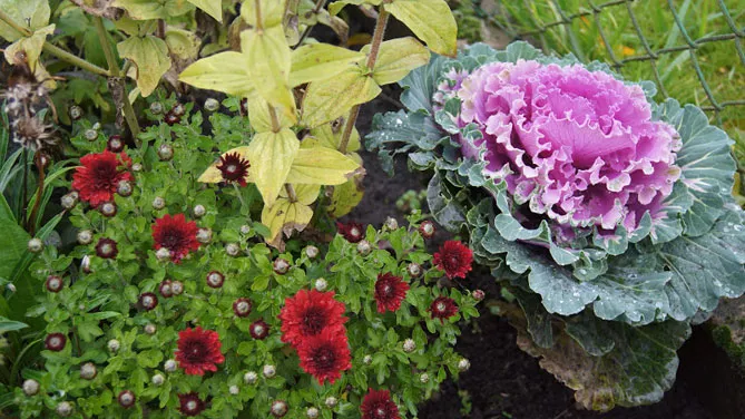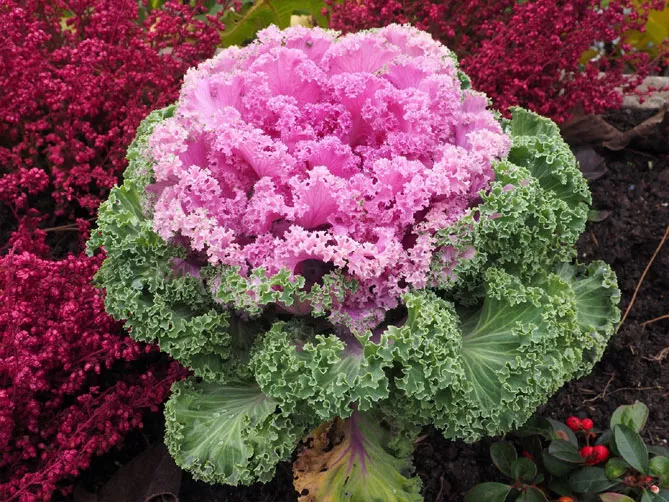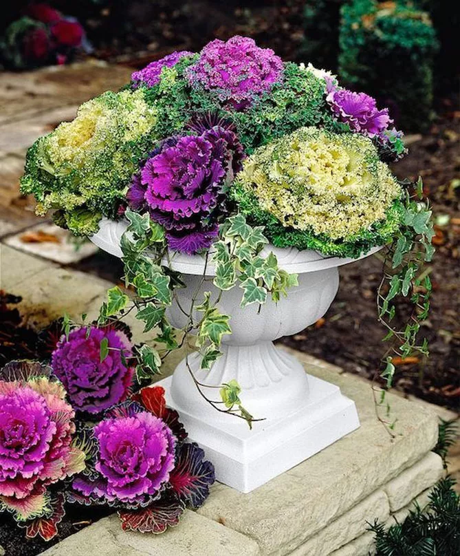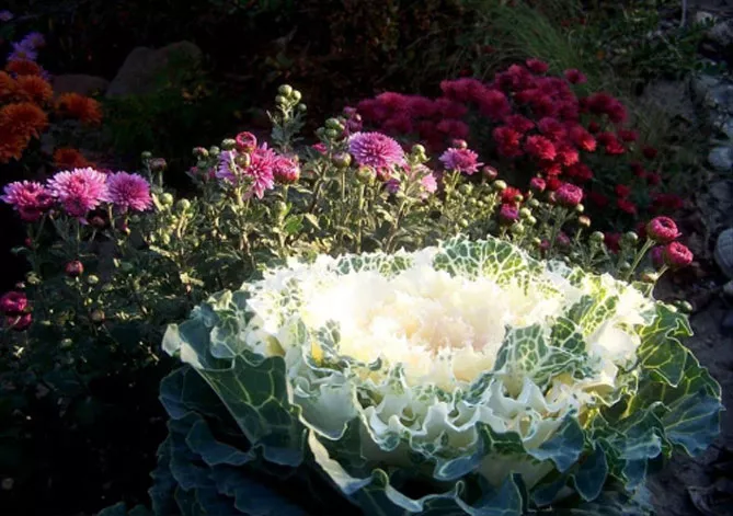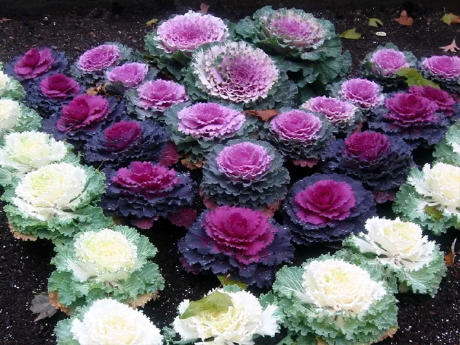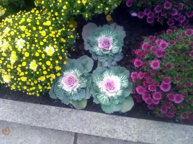Декоративні кущі капусти є цінним доповненням до осінніх клумб, гарно виглядають з: