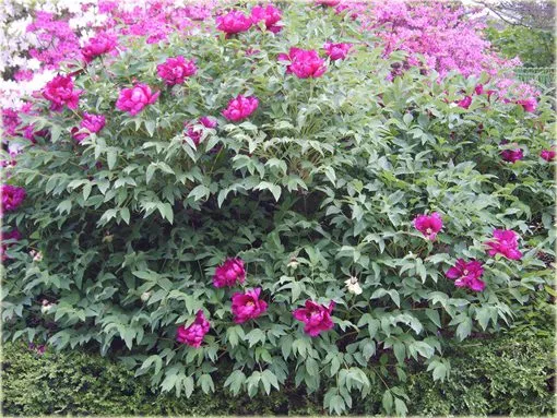 Деревовидна півонія Paeonia suffruticosa – густий кущ із напівсферичною формою, що росте до 1,5 метрів у висоту. Це близький родич популярної півонії. Деревовидні гілки вкриті листям та чудової краси, гігантськими пурпуровими, темно-рожевими квітами. Висаджується півонія невеликими групами або самостійно.