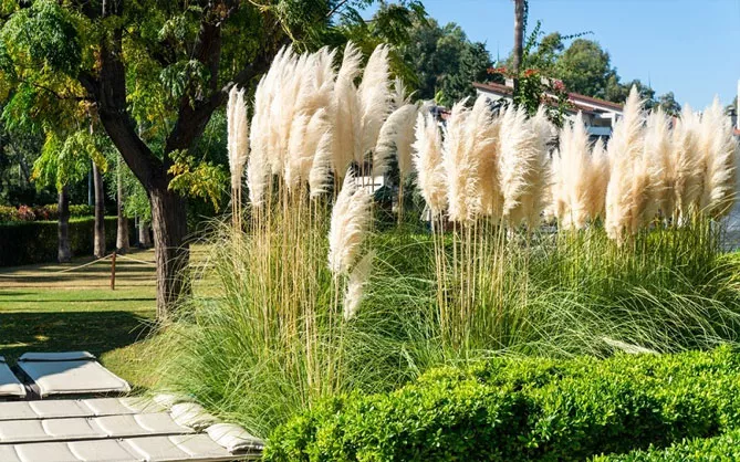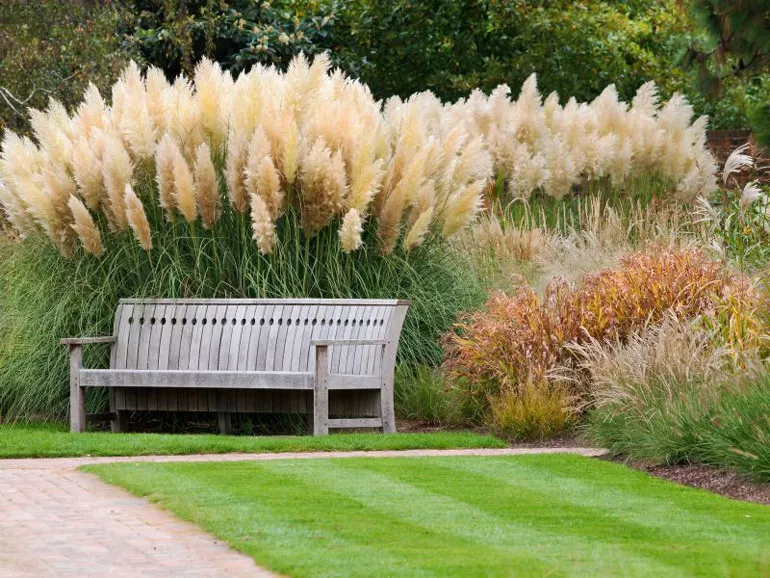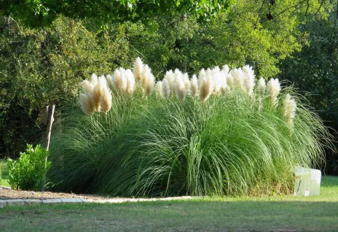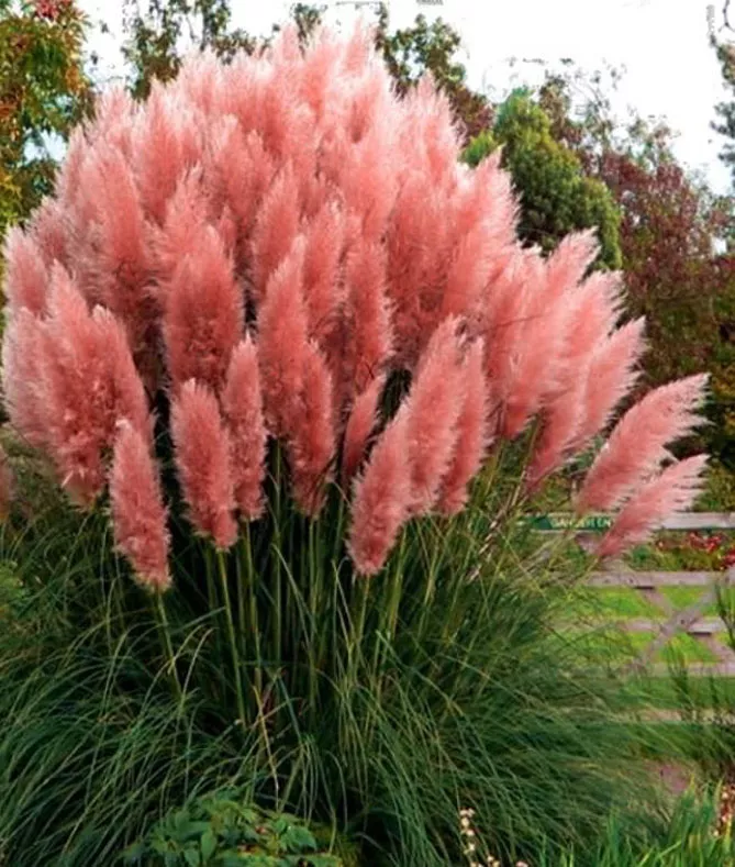Унікальний декоративний злак пампасна трава (Cortaderia selloana) нагадує фонтан з високих листків, який влітку та восени вражає ефектними пір’їстими суцвіттями, що з’являються над листками на жорстких пагонах, що складаються з величезної кількості дрібних шовковисто-рожевих колосків. Частіше метелки білого забарвлення, є сорти з жовтими або рожевими квітами. Красиві метелки квітів переживуть глибоку холодну зиму.