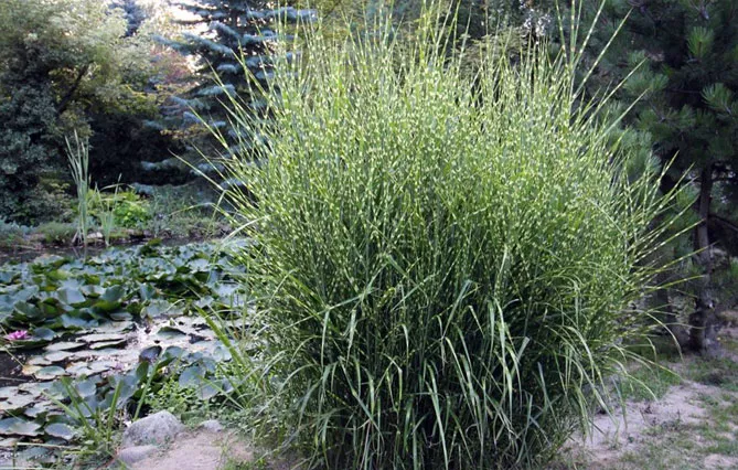 Декоративна багаторічна трава міскантус (Miscanthus) китайський «Зебрінус» – має листки з жовтими поперечними смугами. Прекрасно виглядає як окрема рослина або як одиничний екземпляр в оточенні композиції з інших рослин.